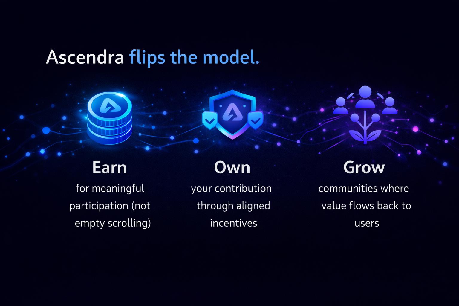 A real utility project built to reward participation, align incentives, and route value back to the people who create it. Ascendra is a #socialfi ecosystem blending social media with decentralized finance - allowing you to earn by engagement. Owned by its users & supporting all the features you know and love.